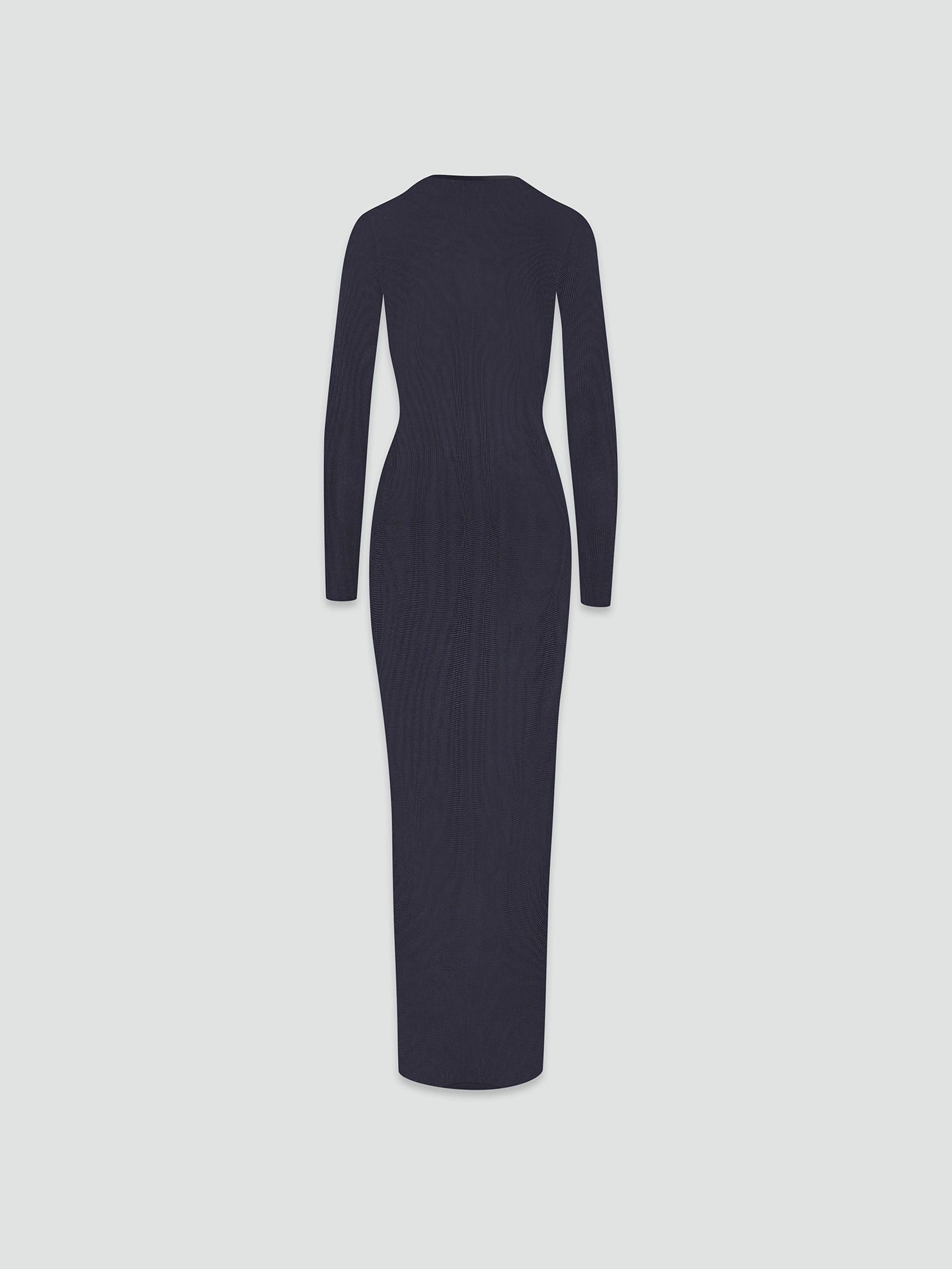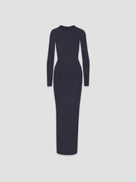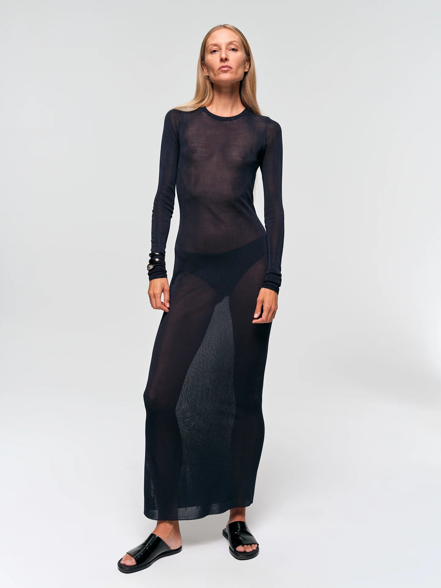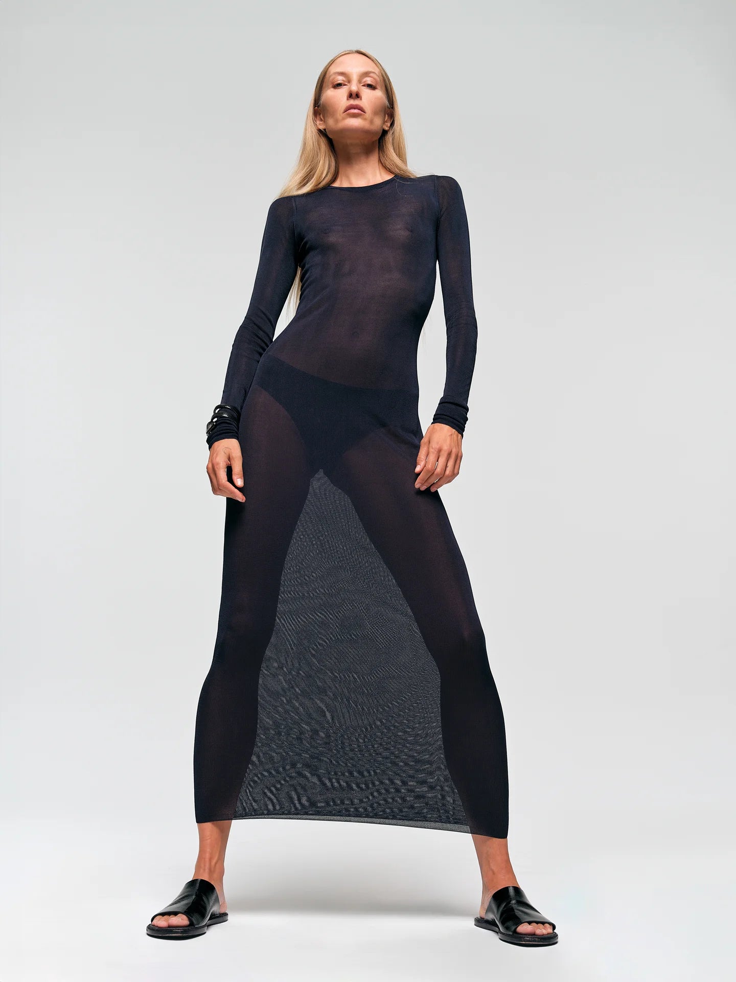 A sheer, crewneck dress with long sleeves and a floor-grazing hemline. This dress is knit in a slinky, super-fine rib with lustre viscose yarn, lending subtle shine and a cool, slick handfeel.