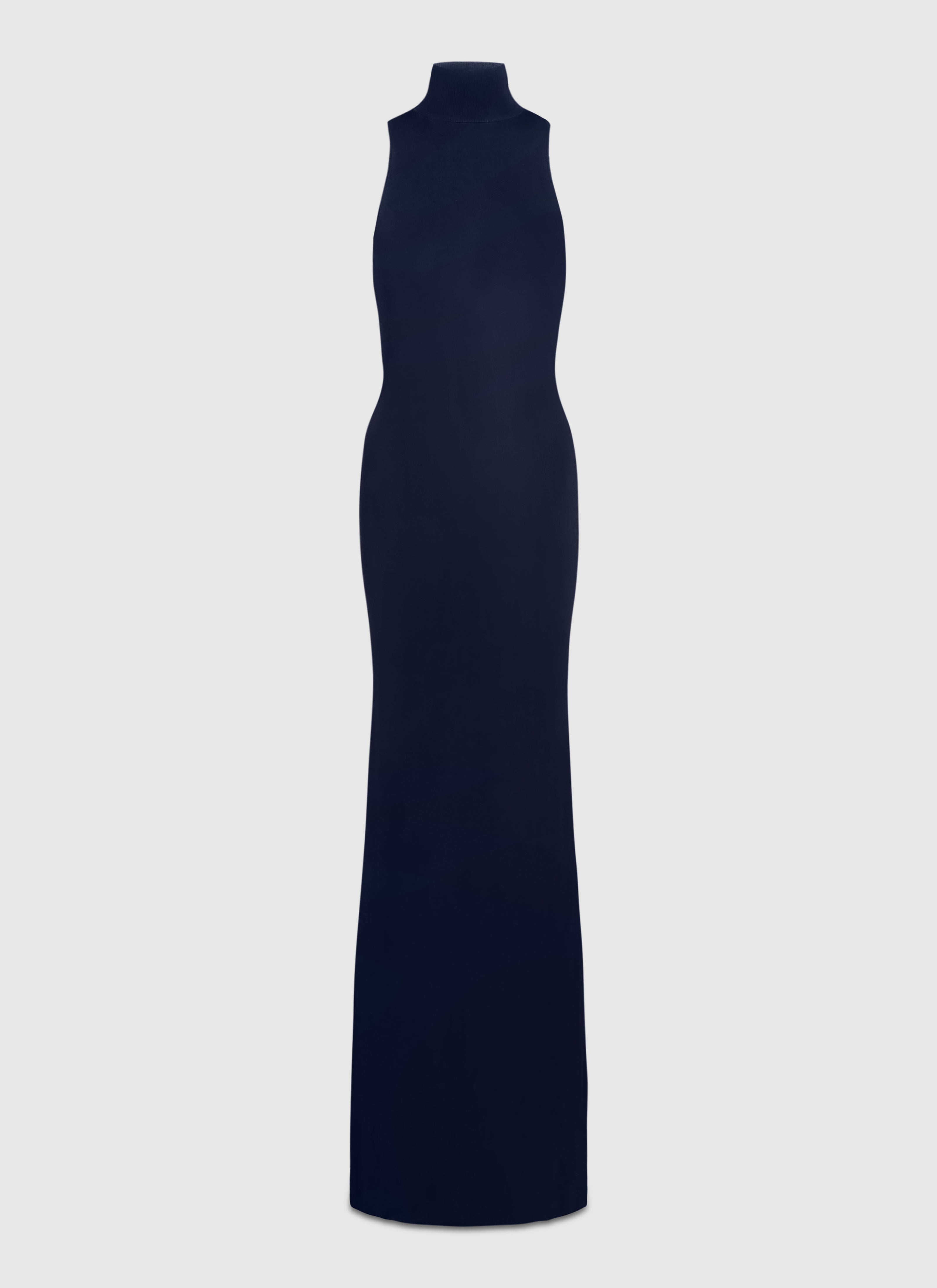 A full-length, sleeveless dress with a turtleneck and a semi-open back. Designed to subtly contour the body before falling to a straight hem. Crafted from slinky, lustrous viscose yarn in a jersey stitch for a smooth handfeel and fluid drape.