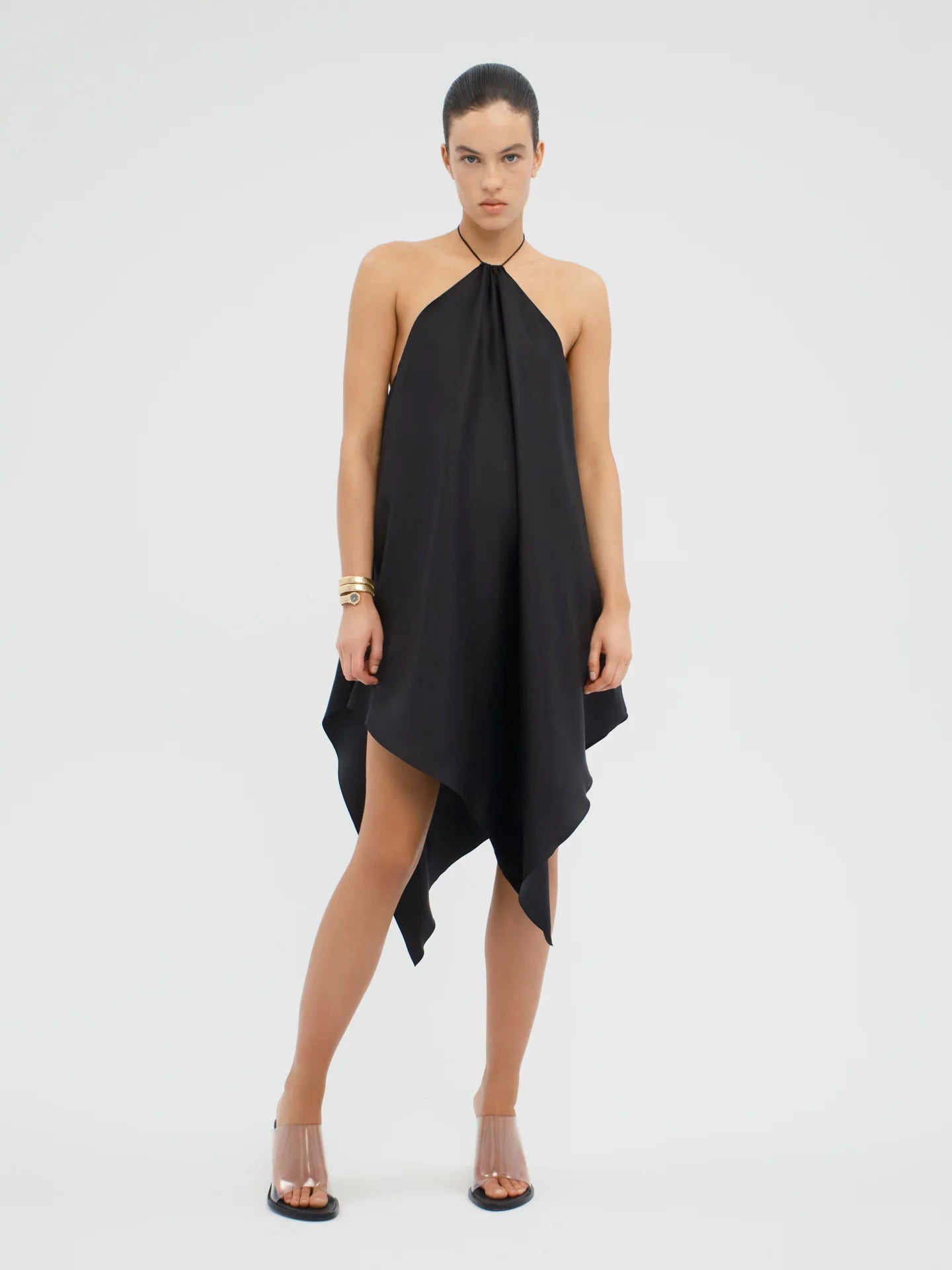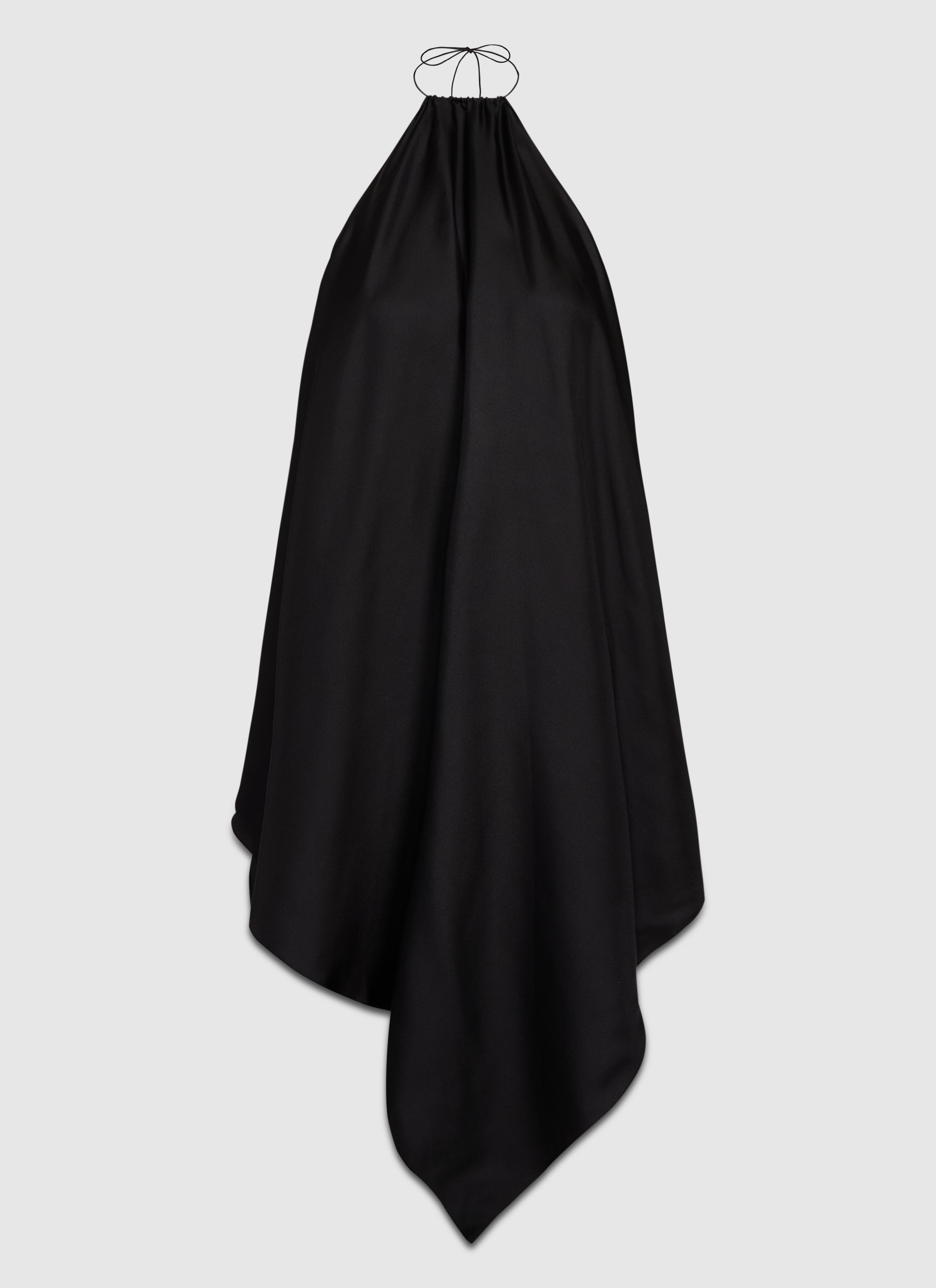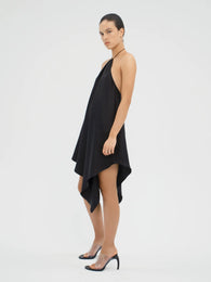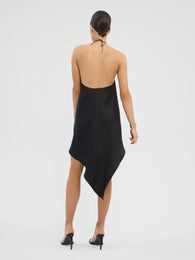 Mini scarf dress with a gathered halter neckline, generous low back, and asymmetrical hem. Finished with an adjustable spaghetti strap tie closure, and cut in ultra-lightweight Italian silk twill with a soft, fluid handfeel.